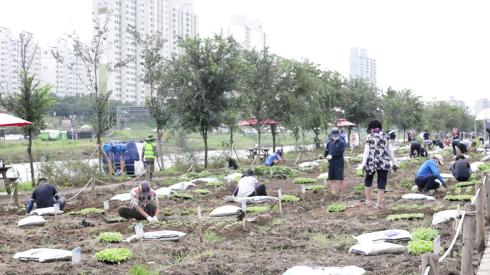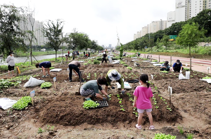 ▲28일 중랑천 둔치 제2체육공원에 조성된 도시농업 체험학습장에서 참여자들이 배추 모종과 무 종자를 심고 있다.(동대문구 제공) |