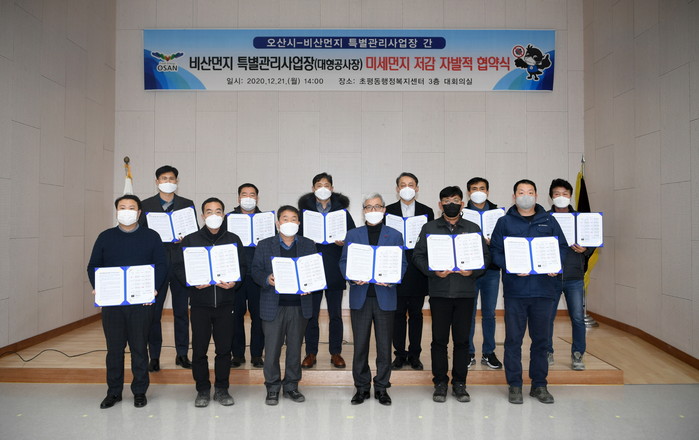 [로컬세계 고용주 기자]경기 오산시는 지난 21일 초평동행정복지센터 대회의실에서 관내 12개 특별관리사업장의 현장대리인들과 함께 미세먼지 감축 공동 협약식을 가졌다고 22일 밝혔다.