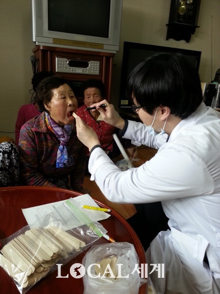 ▲담양군보건소 관계자가 경로당을 직접 방문해 어르신의 입안을 살펴보고 있다. ©로컬세계 |
