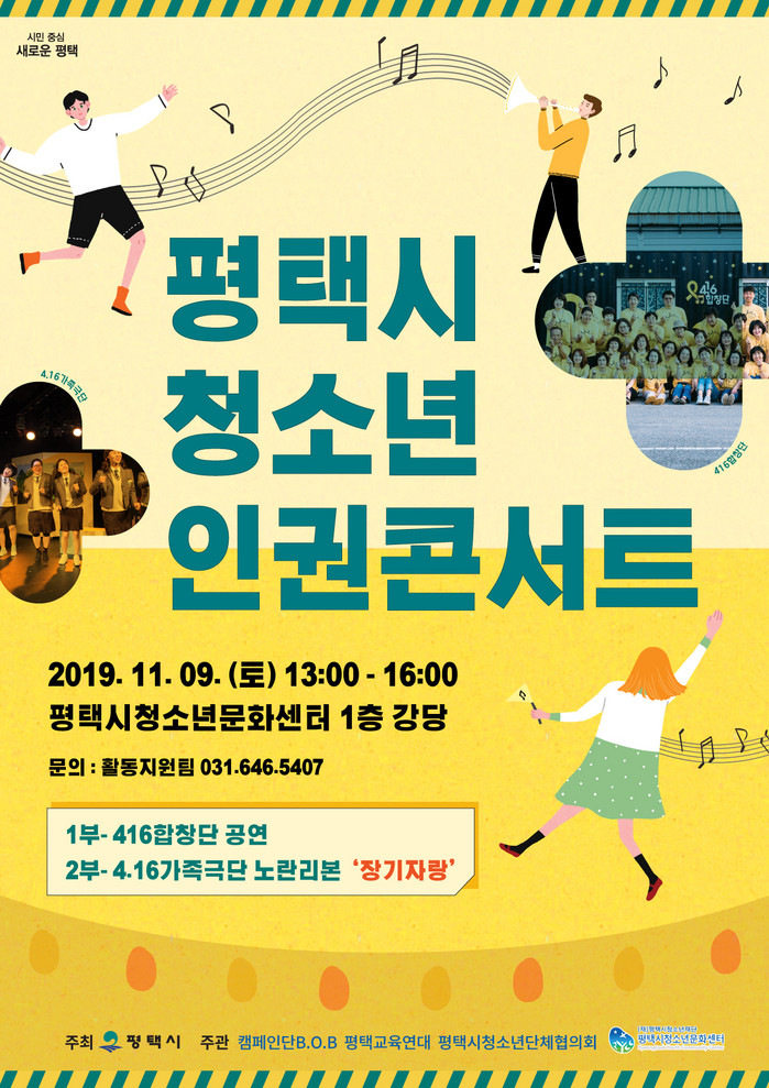 이번 청소년 인권 콘서트는 오는 11월 9일 오후 1시~4시 평택시청소년문화센터 1층 강당에서 열리며 세월호 유가족 416합창단의 합창과 4.16가족극단 노란리본의 연극 ‘장기자랑’, 관객과의 대화가 펼쳐진다.