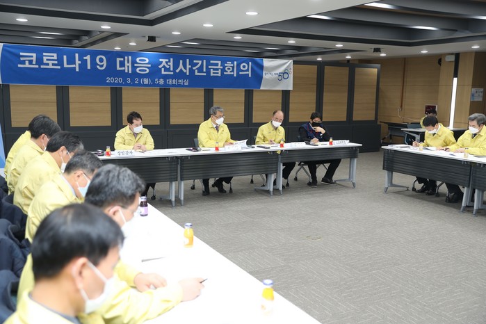 [로컬세계 고은빈 기자]전국의 댐과 정수장 등 국가기반시설을 운영 중인 한국수자원공사(사장 박재현)가 코로나19 확산으로 국가위기수준이 '심각단계'로 격상됨에 따라, 2일 오전 대전시 대덕구 본사에서 '코로나19 대응 전사긴급점검회의'를 가졌다.