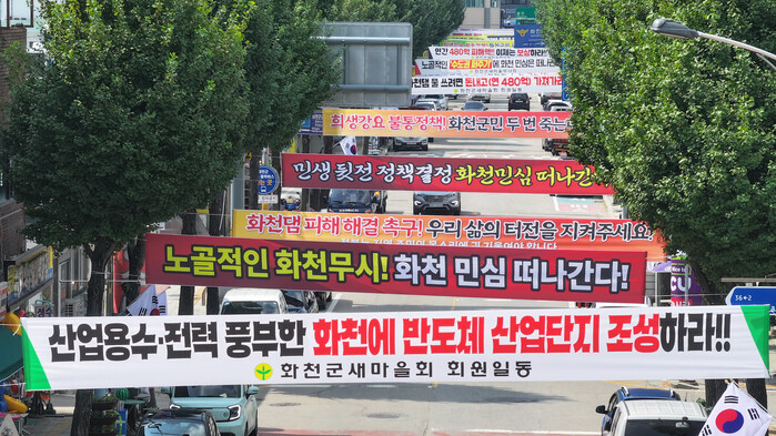 [로컬세계 = 전경해 기자]강원 화천군과 화천군의회, 그리고 지역사회가 정부의 일방적 화천댐 용수 반도체 산업단지 공급결정에 반대하는 집단행동에 나섰다. 13일 화천군 화천읍 중앙로 시가지 곳곳에 현수막 수십여 장을 게시하며 반대 입장을 밝혔다.