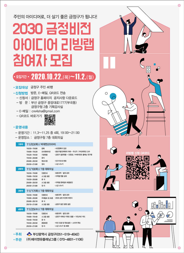 오는 11월 3일부터 25일까지 총 4회에 걸쳐 운영되는 ‘2030 금정 비전 아이디어 리빙랩’은 금정구 기본현황 설명, 2030 금정비전 이해, 지역별 문제점과 해결방안 토론, 전문가 초청 강의·토의 등으로 구성되며, 소그룹별 퍼실리테이터(조력자)가 배치되어 참여자 모두가 의견을 개진할 수 있도록 돕는다.