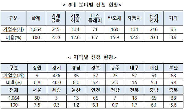 지역별로는 경기 40.0%(426개), 경남 8.0%(85개), 서울 7.5%(80개) 순이며, 소재·부품·장비 기업이 많이 분포한 경기 권역의 중소기업들이 대거  참여한 것으로 나타났다.