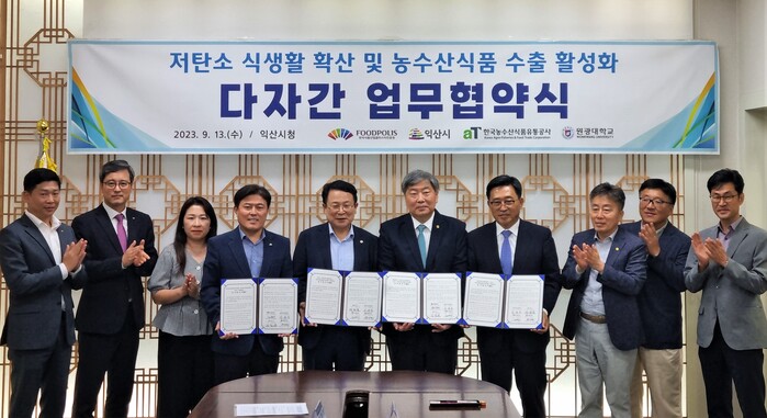 한국농수산식품유통공사(사장 김춘진)는 13일 익산시청에서 익산시, 한국식품산업클러스터진흥원, 원광대학교와 함께 저탄소 식생활 확산과 지역 농수산식품 수출 확대를 위한 업무협약을 체결했다.