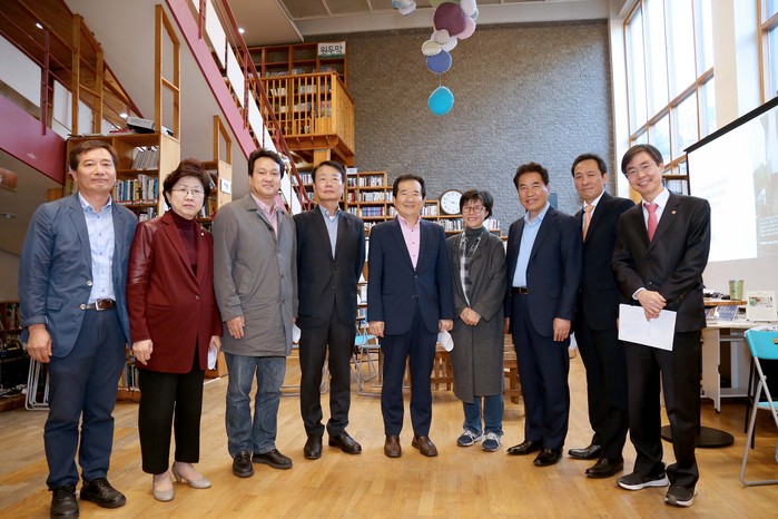 | ▲백군기 용인시장은 12일 수지구 수풍로 느티나무도서관서 안민석 위원장을 비롯한 국회 문체위 소속 의원들의 현장점검에 참석, 도서관 관계자들의 의견을 청취했다.(용인시 제공) |