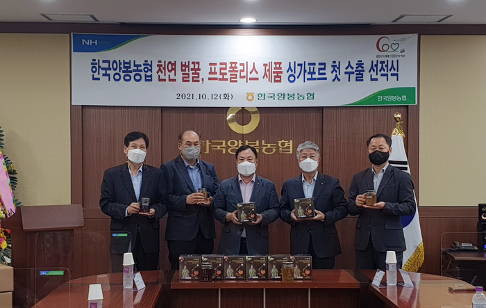 한국양봉농협의 천연 벌꿀과 프로폴리스 제품의 싱가포르 첫 수출 선적식이 12일 한국양봉농협 경제사업본부에서 진행됐다.
