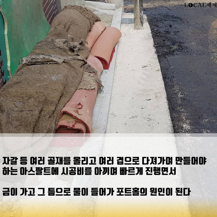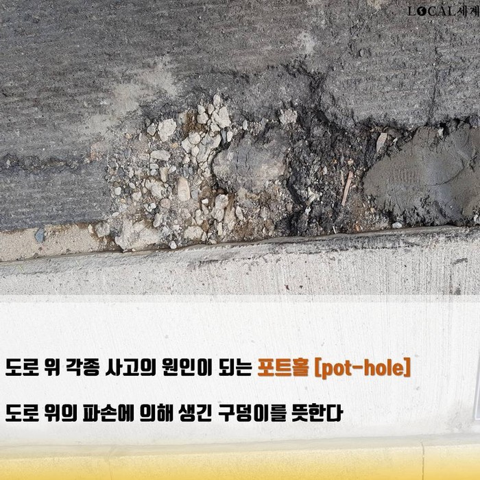 [로컬세계 고은빈 인턴기자]포트홀이란 도로가 파손되어 구멍이 파인 곳을 말합니다. 아스팔트 일부가 부서지면서 생긴 것으로 주로 빗물이나 눈이 스며들어 약해진 아스팔트에 차량이 지나가며 압력이 가해지면서 발생합니다. 특히 아스팔트 시공에 문제가 있었다면 더 흔하게 발생합니다. 카드뉴스로 정리해 봤습니다.