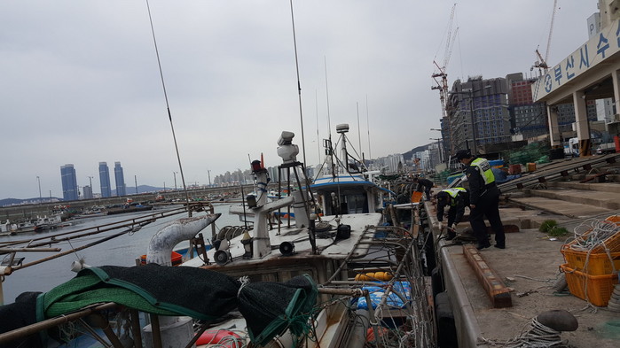 | ▲기상악화에 대비하여 해양경찰관이 민락항 계류상태를 점검하고 있다./부산 해양경찰서 제공 |