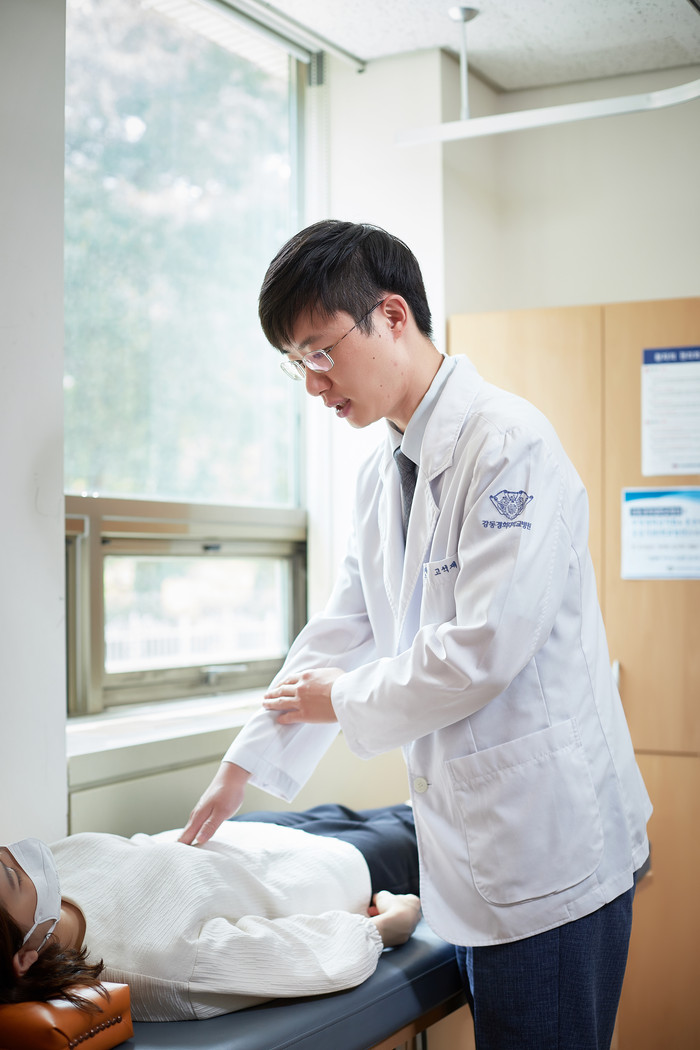 ▲ 강동경희대병원 한방내과 고석재 교수가 한 환자를 진료하고 있다. |