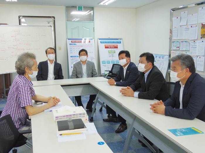 ▲대전시의회 김인식 의장(가운데)이 16일 서구 건양대병원을 방문해 의료진을 격려하며 메르스 확산 차단 방안을 논의하고 있다. |