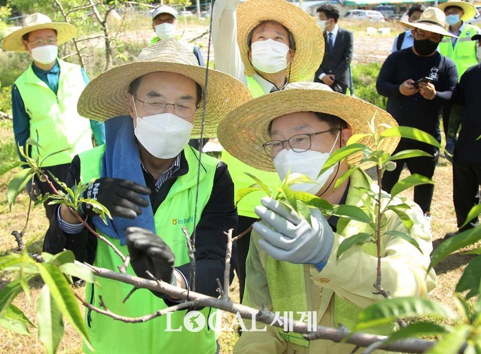 | ▲이성희 농협중앙회장(사진 왼쪽)이 박범계 법무부 장관과 함께 13일 강원도 춘천시 동내면 소재 복숭아 농장을 찾아 일손돕기를 하고 있다. |