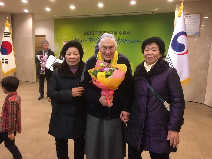 ▲강칼라(74) 수녀(가운데)가 29일 정부서울청사에서 열린 ‘2016 국민추천포상’ 수여식에서 국민훈장 모란장을 받은 뒤 기념촬영하고 있다. |
