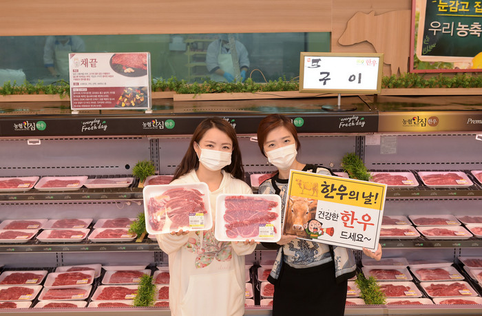 | ▲28일 서울 서초구 청계산로 하나로마트 양재점에서 모델들이 ‘한우데이’를 맞아 한우 소비촉진을 위해 할인 판매하는 행사를 소개하고 있다.(농협유통 제공 |