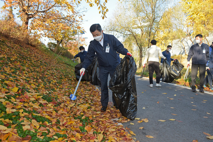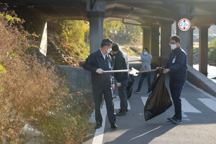 | ▲11일 농협유통 정연태 대표이사 등 임직원들이 추워진 날씨에도 불구하고 매장 인근 여의천 등에서 환경정비 활동을 벌였다.(농협유통 제공) |