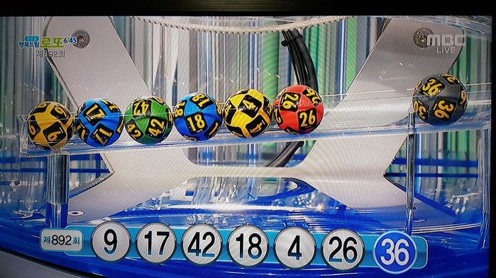 4일 방송된 MBC ‘생방송 행복드림 로또6/45’ 제892회 추첨결과 1등 당첨번호는 ‘4, 9, 17, 18, 26, 42’ 이며 보너스 번호는 ‘36’로 발표됐다.