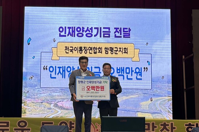 [로컬세계 = 이남규 기자] 전남 함평군은 “지난 10일 열린 제7회 함평군 이장단 한마음대회 중, 전국이통장연합회 함평군지회가 함평군 인재양성기금에 500만 원을 기탁했다”고 밝혔다.