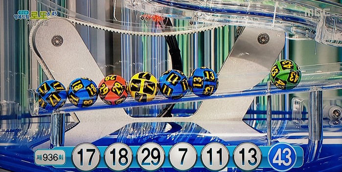 7일 방송된 MBC ‘생방송 행복드림 로또6/45’ 제936회 추첨결과 1등 당첨번호는 ‘7, 11, 13, 17, 18, 29’ 이며 보너스 번호는 ‘43’로 발표됐다.