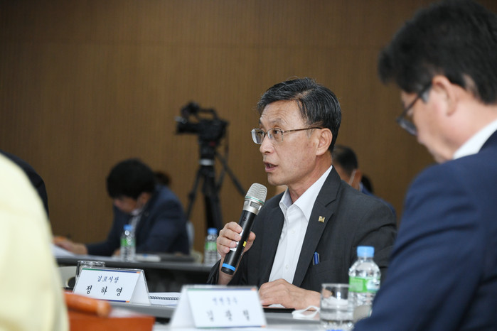 | ▲정하영 시장이 10일 연천군 물문화회관에서 열린 접경지역 시장·군수협의회 임시회의에 참석해 발언을 하고 있다.(김포시 제공) |