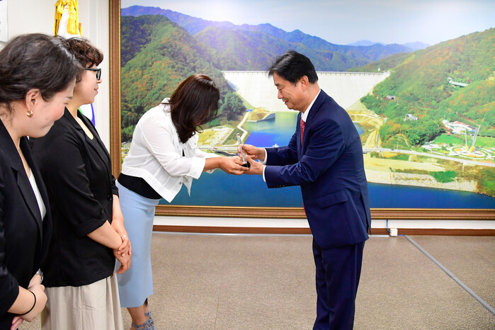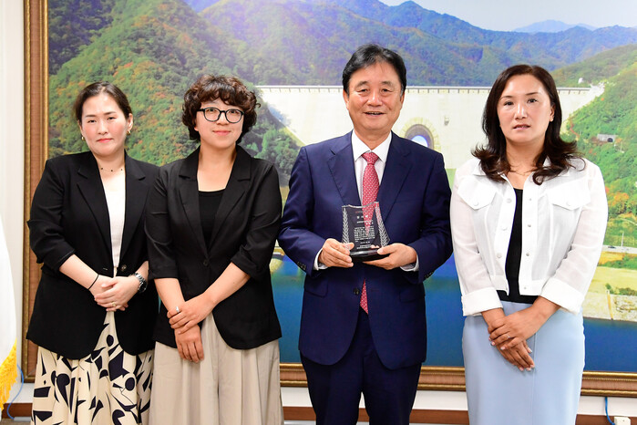 4일 최문순 군수 집무실을 방문한 화천군 학부모 대표들이 감사패를 전달했다. (사진=화천군 제공)