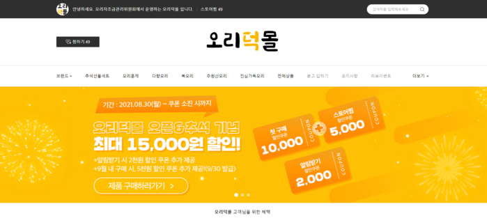 현재 ‘오리덕몰’에서는 오픈 및 추석 기념 대규모 이벤트를 진행하고 있으며, 첫 구매 1만원 할인쿠폰과 스토어찜 5000원 할인쿠폰을 합해 최대 1만5000원 상당의 할인을 제공하고 있다.