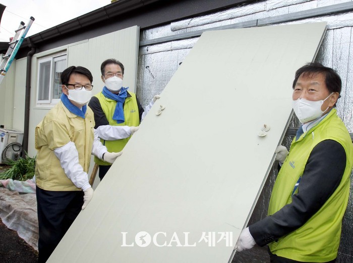 | ▲ 이성희 농협중앙회장(가운데)와 윤후덕 국회의원(오른쪽), 최종환 파주시장(왼쪽)이 25일 경기 파주시에서 진행된 '사랑의 집고치기' 봉사활동 현장에서 자재를 옮기고 있다. |