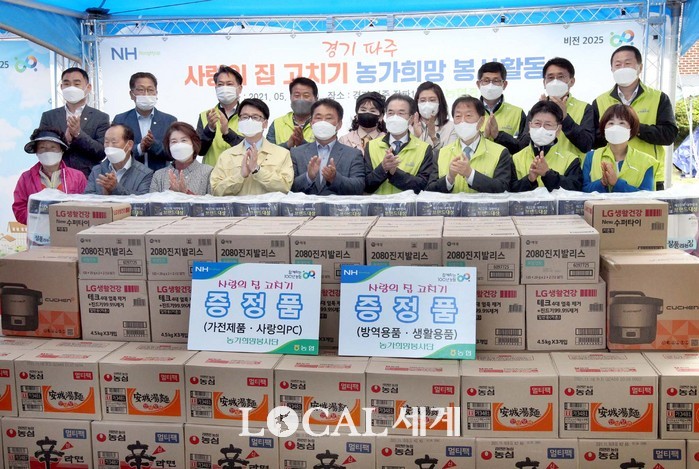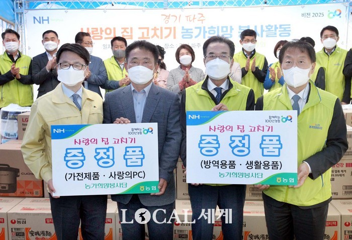 농협중앙회 이성희 회장을 비롯한 '사랑의 집고치기' 농가희망봉사단과 경기농협 임직원 등 50여 명은 경기 파주시 관내 10여농가를 대상으로 시설 개선 등 봉사활동을 실시하고 장파1리 마을회관에 가전제품과 생활용품 등을 전달했다.