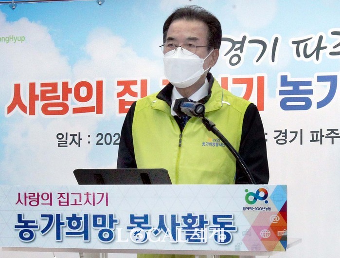 | ▲25일 경기 파주시에서 진행된 '사랑의 집고치기' 봉사활동 현장에서 이성희 농협중앙회장이 인사말을 하고 있다. |