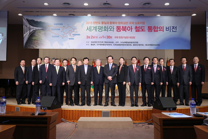 ▲2일 국회 헌정기념관에서 열린 ‘2015 한반도 통일과 동북아 철도통합 국제 심포지엄’에 참석한 내빈들이 기념촬영을 하고 있다.