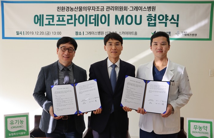 | ▲강용 친환경농산물의무자조금 관리위원장(맨 왼쪽)은 20일, 경기도 일산 그레이스병원(병원장 황경진)과 ‘에코-프라이데이(Eco-Friday) 캠페인’ 업무협약을 체결했다.(사진=친환경농산물자조금 제공) |