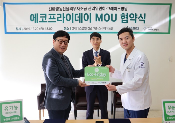 [로컬세계 길도원 기자]친환경농산물의무자조금 관리위원회(위원장 강용, 이하 친환경농산물자조금)는 20일 경기도 일산 소재 참!좋은 그레이스병원(병원장 황경진, 이하 그레이스병원)과 ‘에코-프라이데이’ 업무협약을 체결했다.