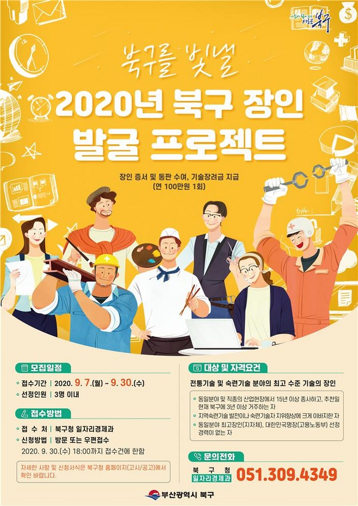 [로컬세계 맹화찬 기자]부산 북구는 산업현장에서 숙련된 기술인으로서 기술을 통해지역사회 발전에 공헌한 주민을 대상으로 ‘북구 장인’을 선정한다고 9일 밝혔다.