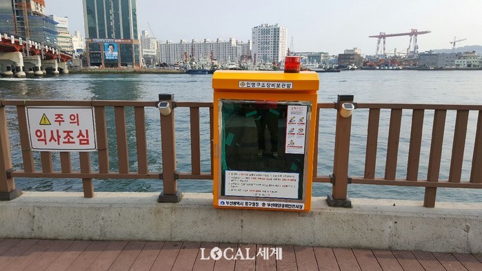 [로컬세계 맹화찬 기자]부산중구(구청장 김은숙)는 지난달 28일 자갈치시장 친수공간 등 3개소에 연안지역 추락, 투신 등 안전사고에 대응하기 위해 인명구조함(구명조끼, 구명환, 유도・투척로프 1식)을 설치했다.