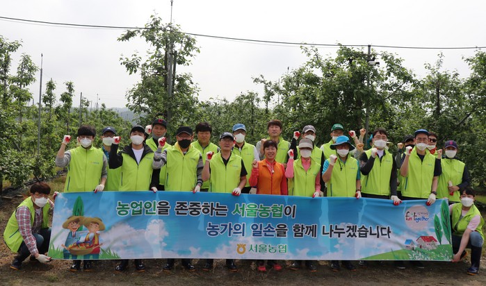 이날 서울농협 임직원 20명은 경기도 포천시 신북면 소재 사과농가를 방문해 시기를 놓치면 안되는 적화작업(사과꽃솎기)을 진행했다.