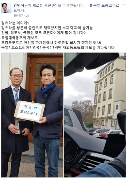 안 의원은 글에서 "정유라를 청문회 증인으로 채택했지만 소재지 파악이 불가능하다"며 "검찰, 외무부, 국정원 모두 모른다? 이게 말이 됩니까?"라고 강하게 질타했다.