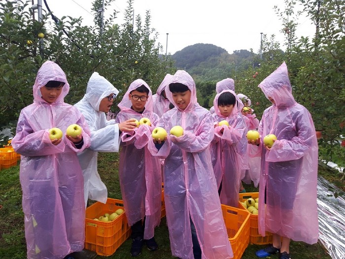 이번 수확행사에는 경기도 용인의 운학초등학교 학생들이 수학여행 일정으로 참석해 황금사과(품종 시나노골드) 수확을 체험했다.
