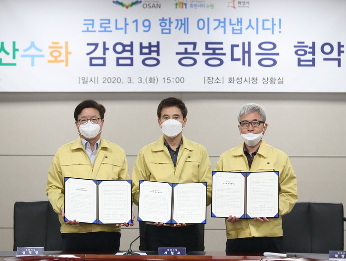 산수화는 3일 오후 3시 화성시청 상황실에서 곽상욱 오산시장, 염태영 수원시장, 서철모 화성시장이 참석한 가운데 업무협약을 체결하고, ‘감염병 공동 협의회’를 출범했다.