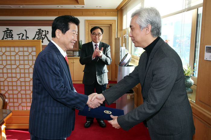 | ▲안상수 창원시장이 김대진 상임지휘자에게 위촉장을 전달하고 악수를 하고 있다.(창원시 제공) |