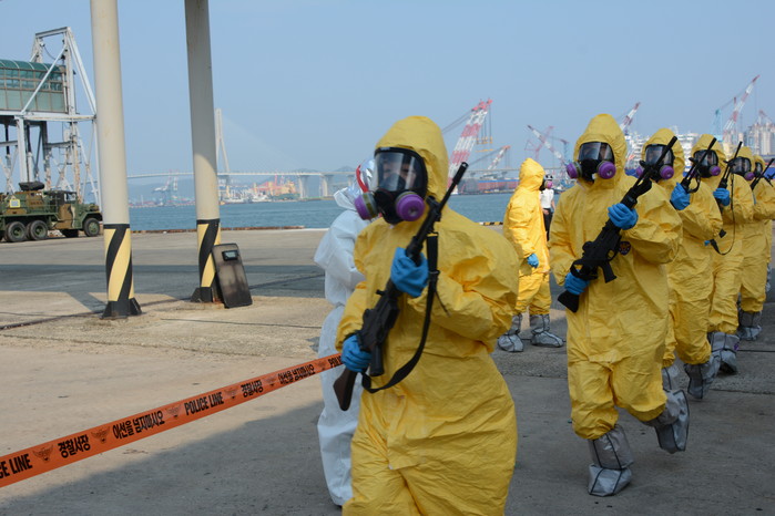 이날 훈련에는 부산중부경찰서, 경찰특공대, 중부소방서, 중구보건소, 군 등 7개의 기관 100여명이 참가, 불상의 테러범이 부산연안여객터미널에 독극물로 추정되는 백색가루를 살포하고 건물에 난입해 인질테러를 벌이는 가상 시나리오를 토대로 보건·소방 제독활동 등 유관기관별 조치와 경찰특공대의 테러범 진압·폭발물 제거 순으로 진행됐다.