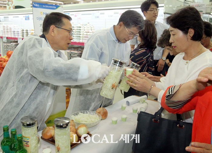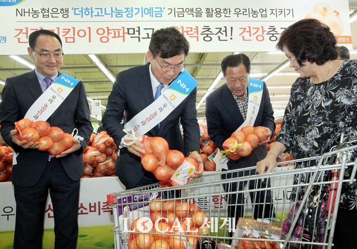 | ▲21일 하나로마트 양재점에서 진행한 ‘양파 농가 지원을 위한 행사’에서 이대훈 NH농협은행장(왼쪽에서 두 번째)이 할인판매하는 양파를 장 보러 온 시민의 카트에 담고 있다. |