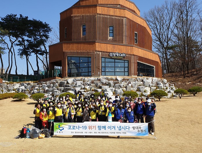 | ▲광교호수공원 방역 활동 참가자들이 다함께 기념촬영을 하고 있다.(수원시 제공) |