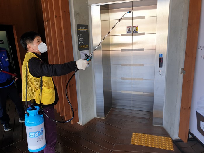 | ▲시민단체 관계자가 방역 소독을 하고 있다. |