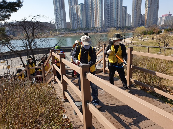 시는 코로나19 사태 장기화에 따른 감염증 확산 방지와 광교호수공원 봄철 방문객 급증에 대비해 방역 소독을 벌였다.