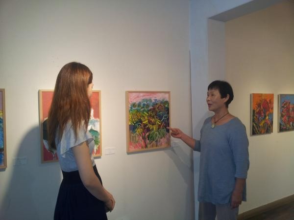 ▲ 김혜자 화백이 전시회를 찾은 관람객에게 자신의 그림에 대해 자세한 설명을 해주고 있다.<사진제공=KNS뉴스 통신> |