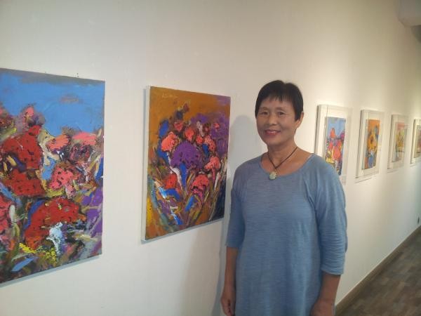 ▲ 광주광역시 동구 소재 무등갤러리에서 열리고 있는 ‘높은 이상 나지막한 호흡’전 에서 김혜자 화백이 밝은 미소로 관람객을 맞이하고 있다.<사진제공=KNS뉴스통신> |