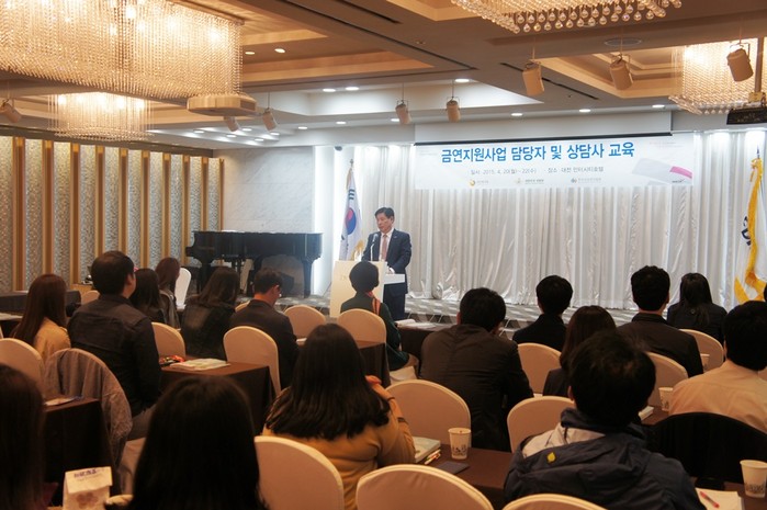 ▲20일 대전인터시티 호텔에서 열린 군인, 의경 금연지원사업에 대한 ‘2015년 금연사업 담당자 및 금연상담사 교육’에서 윤청하 건강증진 본부장이 금연사업에 대해 강의하고 있다. |
