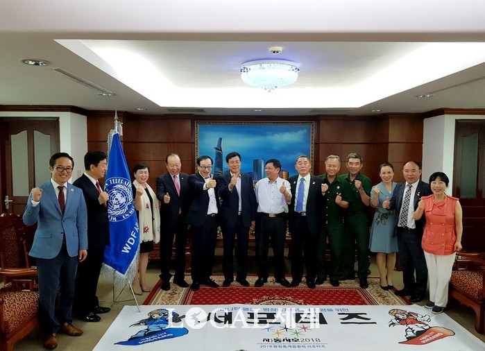 [로컬세계 김재덕 기자]오는 11일 '호찌민-경주세계문화엑스포2017' 개막식 참석차 베트남을 방문중인 세계유통연맹 일행이 앞서 지난 9일 하노이·린빈성 일정을 마치고 10일 호찌민에 도착해 재향군인회를 방문, 다오 주안 토 부회장과 면담을 갖고 '2018 평창동계올림픽'을 알렸다. 이 자리는 정현조 월남전참전자회 본부장(전 서울 지부장)의 주선으로 이뤄졌다.