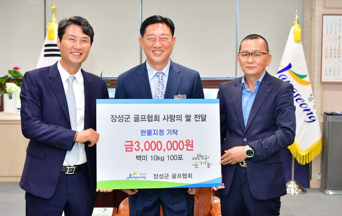 ▲ 좌측부터 장성군 골프협회 신임 조이현 회장, 김한종 장성군수, 나회일 전임 회장. |
