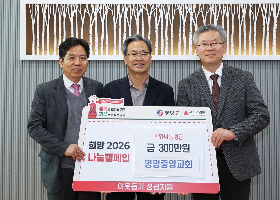 같은 날 영양중앙교회(담임목사 김신영)도 영양군청을 찾아 성금 300만 원을 기탁하며 ‘희망2026나눔캠페인’에 동참했다.