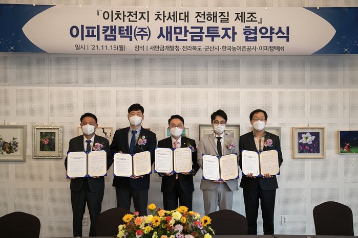 이날 협약식에는 이성권 이피캠텍㈜ 대표이사, 강임준 군산시장, 양충모 새만금개발청장, 윤동욱 전라북도 새만금해양수산국장, 김우상 한국농어촌공사 새만금산업단지사업단장 등이 참석했다.